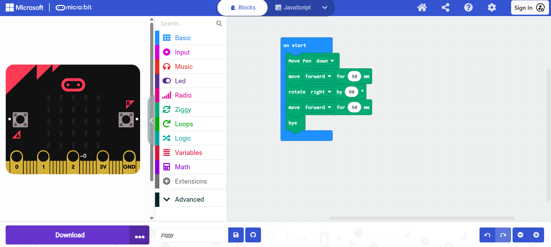 Test the code by uploading it, turning the Ziggy on, and pressing button A.